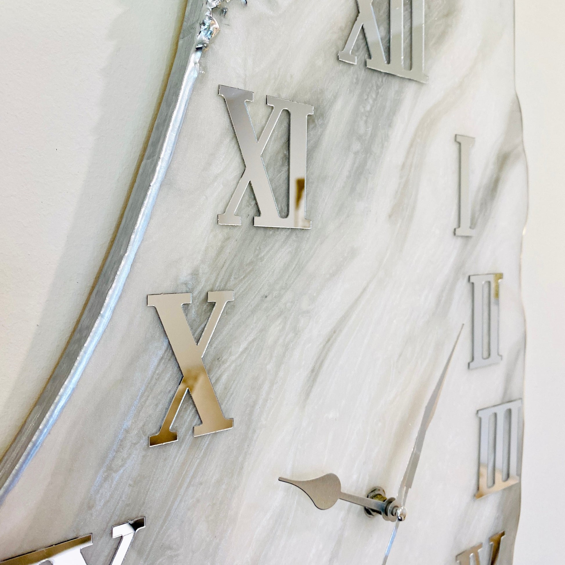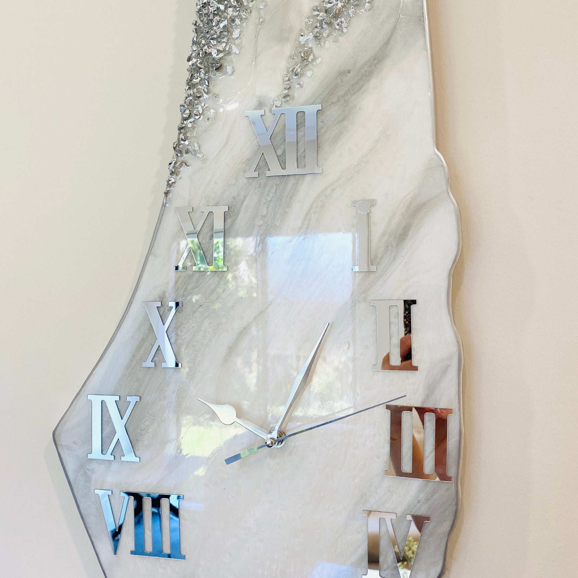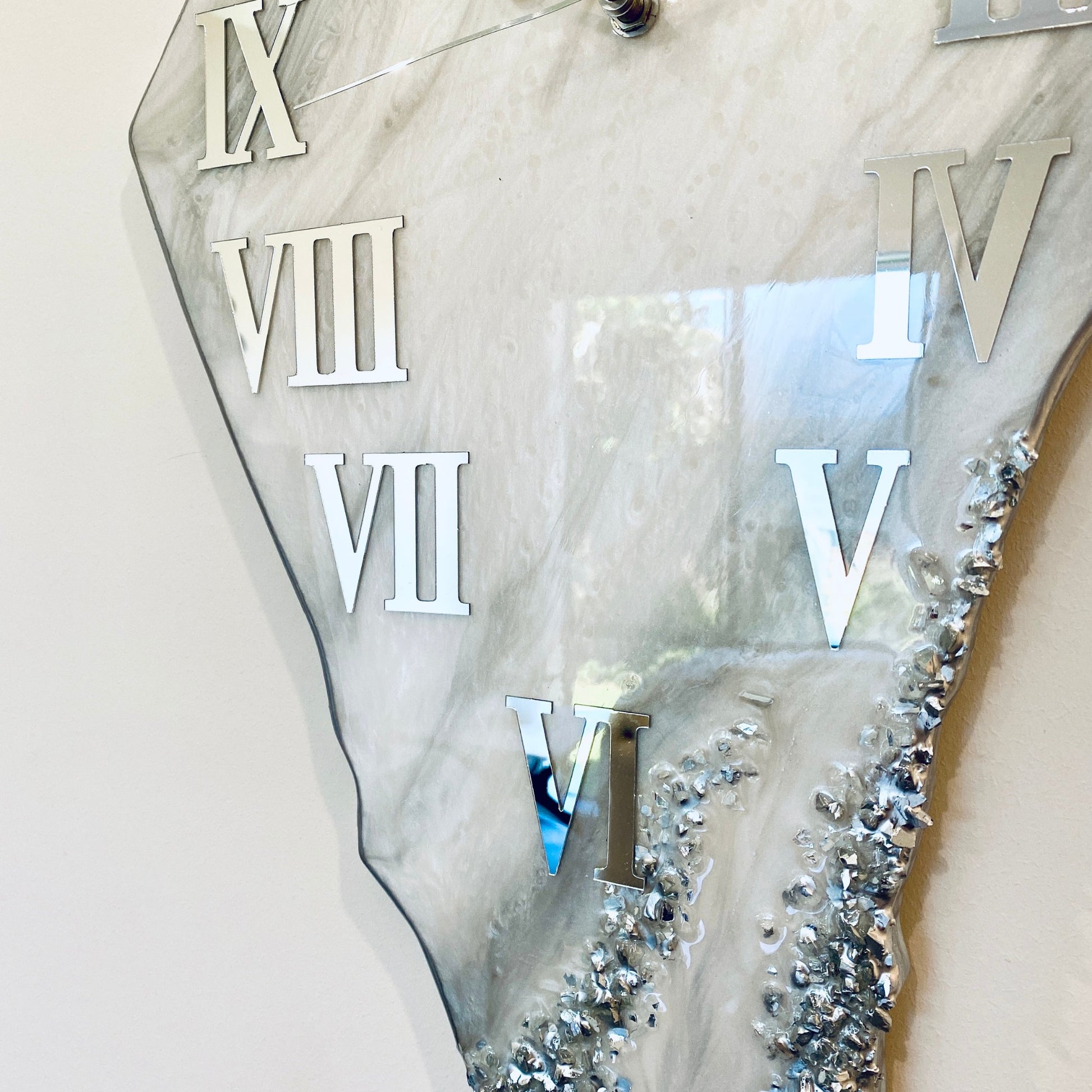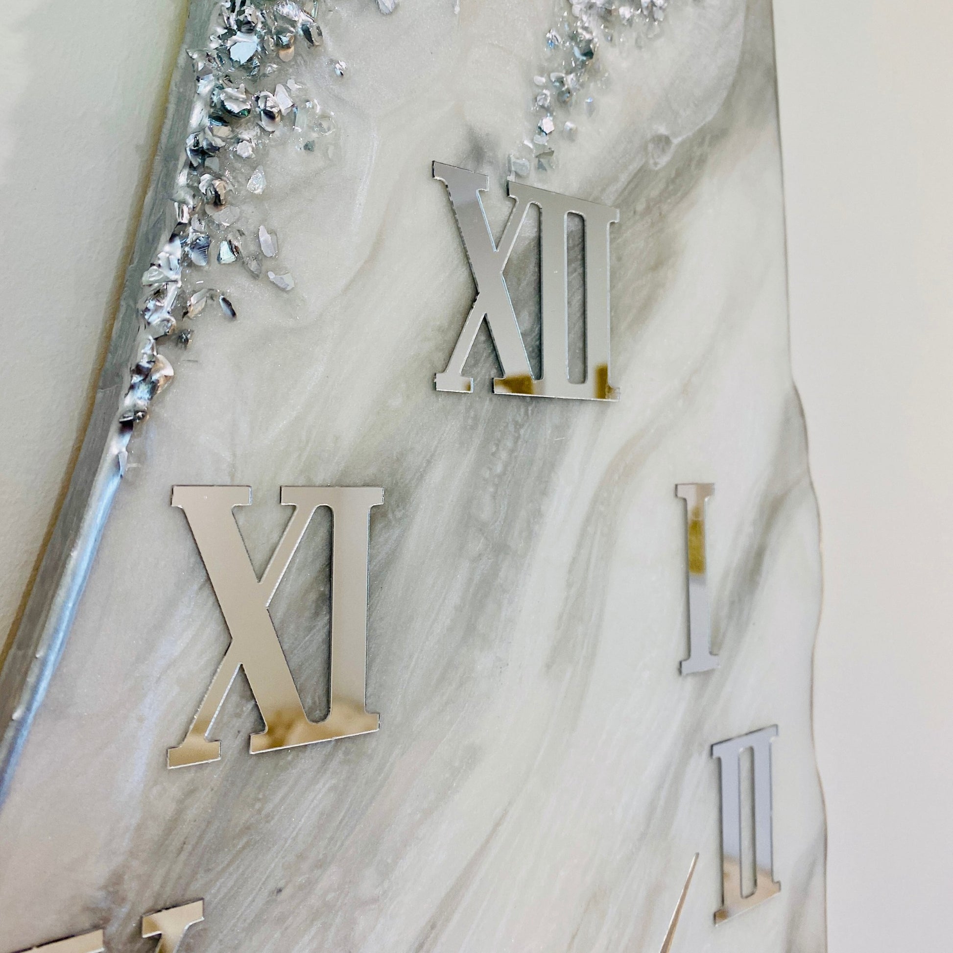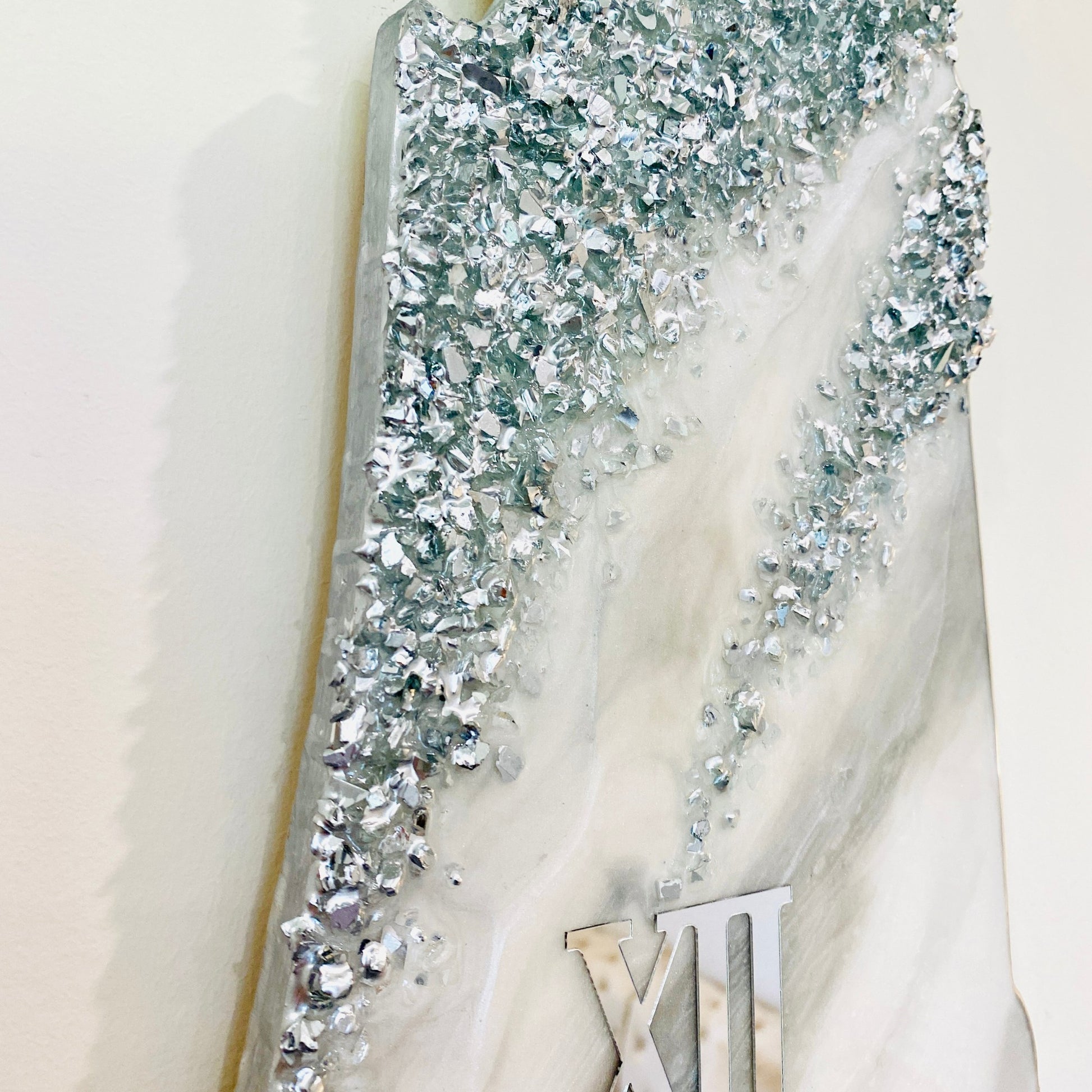 - Glossy resin and silver-coated broken glass for a luxurious finish.