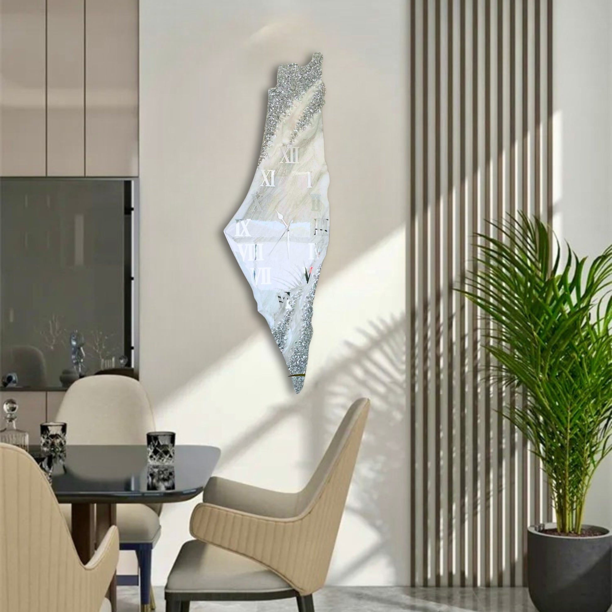 Add a meaningful touch to your home or office with this stunning Palestine Map Wall Clock, a handcrafted masterpiece designed to inspire and captivate. Made from high-quality wood and finished with a glossy resin coating, this unique timepiece features broken glass details with silver accents, elevating its artistic charm.